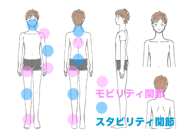 「動き」に特化した関節を『モビリティ関節』、「固定・安定」に特化した関節を『スタビリティ関節』といいます。そして、『スタビリティ関節』と『モビリティ関節』は交互に存在しています。